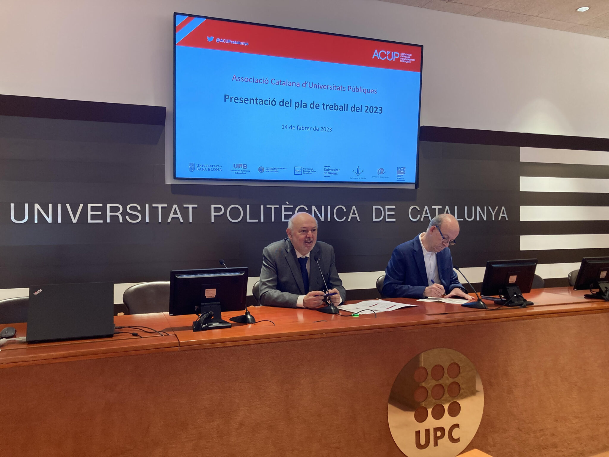 El president de l’Associació Catalana d’Universitats Públiques (ACUP) i rector de la Universitat Politècnica de Catalunya – BarcelonaTech (UPC), Daniel Crespo, ha presentat el nou pla de treball del 2023 de l’Associació, aprovat el passat 24 de gener per l’assemblea general. Ho ha fet en una roda de premsa a la Sala de Juntes del Rectorat de la UPC, acompanyat pel secretari executiu de l’ACUP, Josep M. Vilalta. Durant l’acte, ambdós han presentat la nova junta directiva de l’Associació i han exposat els principals objectius i projectes que l’ACUP s’ha marcat com a prioritaris per a aquest nou mandat i al llarg de l’any 2023.